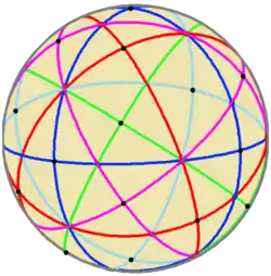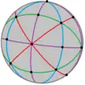 , recibe la notación de Coxeter [p,q] según los órdenes de las ramas. Cada nodo en el diagrama de Coxeter representa un espejo, por convención llamado ρi (y matriz Ri). Los generadores de este grupo [p,q] son reflexiones: ρ0, ρ1 y ρ2. La subsimetría rotacional se define como producto de reflexiones: por convención, σ0,1 (y la matriz S0,1)= ρ0ρ1 representa una rotación del ángulo Π/p, y σ1,2= ρ1ρ2 es una rotación del ángulo Π/q, y σ0,2= ρ0ρ2 representa una rotación según un ángulo de Π/2.