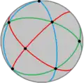 . Los generadores de reflexión, a partir de una construcción D3=A3, son las matrices R0, R1, R2. R02=R12=R22=(R0×R1)3=(R1×R2)3=(R0×R2)2=Identidad. [3,3]+ (![]()