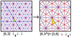 = A2×A2 = 2A2 se puede representar mediante [3]×[3] = [3]2 = [3,2,3 ]. A veces, las 2 ramas explícitas pueden incluirse con una etiqueta 2 o con una línea con un espacio: ![]()