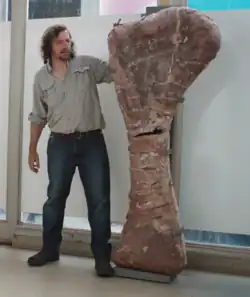 Húmero del gigantesco dinosaurio Notocolossus junto a su descubridor, el paleontólogo argentino Bernardo J. González Riga.