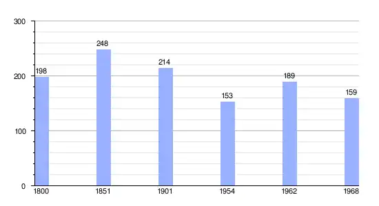 Los datos demográficos contemplados en este gráfico de la comuna de Notre-Dame-de-Fresnay[4] se han cogido de 1800 a 1968 de la página francesa EHESS/Cassini.