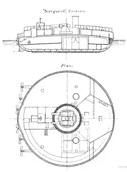 Botado el 21 de mayo de 1873, el acorazado Almirante Novgorod fue diseñado por el almirante Andrey Alexandrovich Popov, con el propósito de crear una plataforma armada y acorazada estable, con un par de cañones pesados, que pudiese operar en aguas costeras. En teoría, la ventaja de un casco circular era que una pequeña nave podría llevar el mismo armamento que otra mayor de una forma más ordinaria. Su peso máximo era de 2 671 t. El armamento principal del Almirante Novgorod eran dos cañones de 11 pulgadas y 26 t, montados sobre sendos afustes giratorios independientes. El barco montaba un total de seis motores a vapor, que funcionaban cada uno para un eje propulsor. La caldera y la sala de máquinas ocupaban la mitad del espacio interior. Las calderas estaban situadas en dos compartimentos separados, uno para cada chimenea. Solía llevar en cubierta cuatro botes salvavidas a vapor.