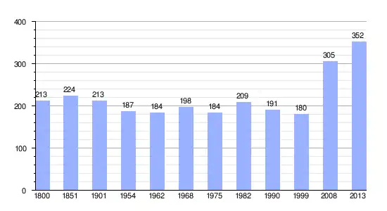 Los datos demográficos contemplados en este gráfico de la comuna de Noyant-la-Plaine[4] se han cogido de 1800 a 1999 de la página francesa EHESS/Cassini, y los demás datos de la página del INSEE.[5]