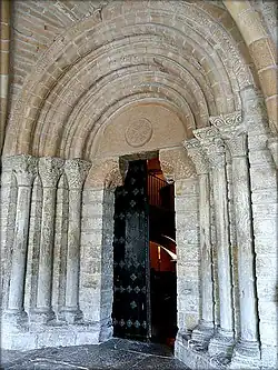 Este pórtico lateral consta de dos entradas: una de medio punto simple orientada al Sur, frente a la puerta de acceso a la iglesia, y otra de arco de medio punto que mira al Este. El portal de acceso a la iglesia es abocinado de medio punto con tres arquivoltas sobre columnas con capiteles impresos de tema vegetal y entrelazos. El tímpano cuenta con un crismón trinitario y se apoya en dos ménsulas que representan un toro, a la izquierda, y un león devorando a un hombre, a la derecha.[55][56][57][58]