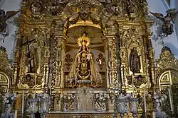 El altar mayor está más elevado al nivel del suelo con respecto al resto de edificio, este espacio está escoltado por una reja y un ambón de forja dorada.[3]