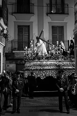 Además del Cristo que preside el frontal del paso, tras él se encuentra ayudándolo a cargar con la cruz una imagen de Simón de Cirene (Cirineo) tallado por el anteriormente mencionado imaginero D. Santiago Arolo Viñas en 1977. El Cirineo cada año es vestido de forma diferente pero sencilla. También se incorporó posteriormente la Virgen del Rosario, perteneciente a la Parroquia de Santo Domingo que contaba con Hermandad propia fundada en el siglo XVI y actualmente desaparecida. La imagen es una imagen de vestir del siglo XVIII, probablemente obra de Sánchez Taramás por su parecido con otras obras como la Virgen de Bótoa o la Virgen de las Mercedes de la Parroquia de San Andrés.