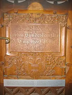 En octubre de 2006, la Iglesia católica añadió una placa adicional a la placa conmemorativa grabada en madera dedicada al canciller Engelbert Dollfuß, la cual produjo agitación en el seno del partido político ÖVP. En la placa adicional, la Iglesia se distancia de la política de Dollfuß tras una resolución de la Conferencia de Obispos Católicos de Austria, en consecuencia se distancia del texto original grabado en 1934 y anuncia la futura abstención de la política de partidos. Dollfuß siendo canciller de Austria suprimió el Parlamento por irregularidades formales con el fin de evitar que los nacionalsocialistas amenazaran con ganar las elecciones mediante una dictadura estatal corporativa. Eso causó la Guerra Civil Austríaca y condujo a la dictadura del austrofascismo.[1][2] La placa original se erigió en 1934 tras su asesinato a manos de los nacionalsocialistas.
