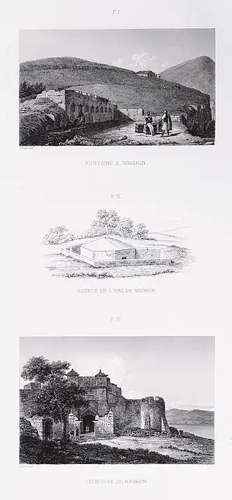 - ↑ «1. Οθωμανική κρήνη στην Πύλο. 2. Δεξαμενή νερού στην Πύλο. 3. Η είσοδος του Νιόκαστρου στην Πύλο. - BLOUET, Guillaume-Abel - ME TO BΛΕΜΜΑ ΤΩΝ ΠΕΡΙΗΓΗΤΩΝ - Τόποι - Μνημεία - Άνθρωποι - Νοτιοανατολική Ευρώπη - Ανατολική Μεσόγειος - Ελλάδα - Μικρά Ασία - Νότιος Ιταλία, 15ος - 20ός αιώνας». el.travelogues.gr. Consultado el 3 de julio de 2020.