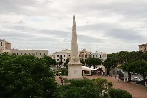 Preside la plaza del Born, y está a la vista de una serie de palacios y edificios importantes del casco antiguo: el renacentista Martorell; el neoclásico Torre-Saura; el palacio Salort; el teatro des Born; el Ayuntamiento de Ciudadela (antiguo Alcázar); mirador en el puerto; e iglesia de San Francisco de Asís (siglo XIII). El monumento tiene veintidós metros de altura. Cada viernes y sábado se monta un mercado a los pies del obelisco y los comerciantes ocupan casi toda la plaza.