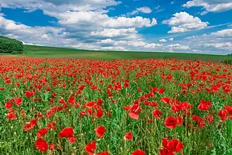 De arriba hacia abajo, de izquierda a derecha: Campo de amapolas en el óblast de Leópolis, cima de la montaña de Parashka, pastos del raión de Drohóbych y pantano en el pueblo de Neslujiv.