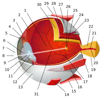 ![]() Diagrama del ojo con la vena central de la retina con el N.º 21 | ||