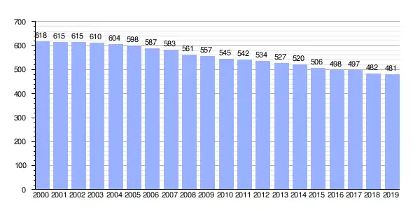 | Gráfica de evolución demográfica de Oca (aldea) entre 2000 y 2019 |