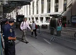 - ↑ a b Marcinek, Laura (19 de septiembre de 2011). «Wall Street Areas Blocked as Police Arrest Seven in Protest». Businessweek. Consultado el 21 de septiembre de 2011.
