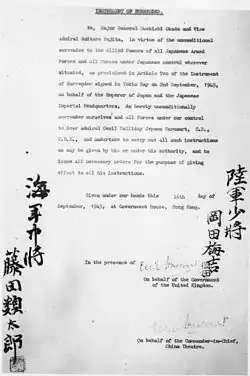 La ocupación japonesa de Hong Kong terminó al acabar la guerra en 1945.[5] Estados Unidos lanzó bombas atómicas sobre Hiroshima el 6 de agosto de 1945.[28] y sobre Nagasaki tres días después, el mismo día que la URSS comenzó la Operación Ofensiva Estratégica de Manchuria, que paralizó al último gran ejército japonés en China.[28] Japón finalmente se rindió el 15 de agosto de 1945.[29] El control británico sobre Hong Kong fue restablecido.