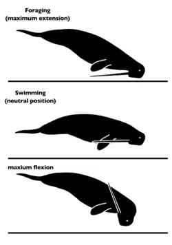 Se cree que a la hora de alimentarse Odobenocetops extendía su cuello, posicionando su cabeza paralela al suelo marino, con los colmillos tal vez tocándolo, con una extensión máxima de 45° respecto al torso. Aquí de nuevo presenta rangos convergentes con la morsa. Muizon y colegas contrastan esto con la posición de sirénidos como el dugón, capaces de nadar paralelos al suelo marino gracias a sus huesos más densos que los de cetáceos y focas. La tensión muscular a la hora de alimentarse viene de un flexible cuello, capaz de moverse en un rango verticxal cercan a 83°; esto incluye la extensión alimentaria de 7° y una flexión máxima de 90°. Esto sobrepasa el rango de la beluga, el cetáceo moderno más flexible, con un rango de unos 50°.[7] El propósito exacto de la gran flexibilidad permanece en el misterio, pero queda claro que esto traería la punta del colmillo derecho masculino por encima de la espalda.[7]