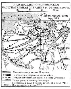 Ralentizado debido al mal tiempo, típico del invierno ruso, entre el 13 y el 14 de enero, unidades del 2.º Ejército de Choque fueron las primeras en atacar desde la cabeza de puente de Oranienbaum, y un día después las tropas del 42.º Ejército se unieron a la ofensiva, atacando desde el área de Pulkovo. Ambos ejércitos soviéticos avanzaron en la dirección general de Krasnoe Selo y Ropsha.[29]