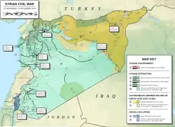 ![]() Situación de Siria al final de la ofensiva, en verde lo controlado por los rebeldes y opositores árabes y en amarillo por los kurdos. | ||||