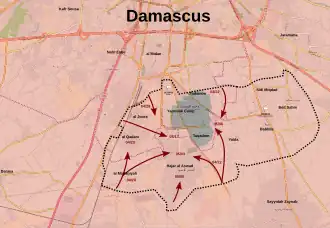 - ↑ «Map update: Syrian Army maintains control over key neighborhood in southern Damascus - Muraselon» (en inglés británico). 22 de abril de 2018. Archivado desde el original el 24 de abril de 2018. Consultado el 23 de abril de 2018.