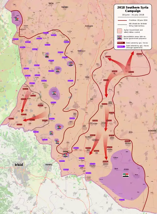 - ↑ «Syrian Army captures 230km2 of territory along Jordanian border – map». Al-Masdar. 6 de julio de 2018. Archivado desde el original el 1 de mayo de 2019. Consultado el 10 de julio de 2018.