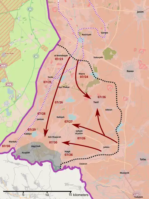 Entre el 27 y el 28 de junio se registraron víctimas civiles especialmente graves, y el opositor Observatorio Sirio de Derechos Humanos (SOHR) registró 46 muertos en dos días en los bombardeos de Bosra al-Sham y otras ciudades.[97] El 27 de junio, las SAA capturaron la Base de la Brigada 52, así como una aldea al sur de la misma. Más tarde, el ejército capturó otros ocho lugares que estaban desiertos o fueron entregados por las fuerzas rebeldes, incluyendo Al-Hirak y dos bases,[98][99][100] aunque el SOHR dijo que los combates continuaron en Al-Hirak.[97] Dos días después, fuentes gubernamentales informaron que algunos grupos rebeldes y líderes en la parte sur de la provincia de Daraa en ciudades como Tafas, Da'el, Ibta, Al-Karak, Al-Jay'lah, al este de la ciudad de Daraa acordaron rendirse. al gobierno sirio.[101][102] Según informes, el ejército sirio también capturó otros tres lugares de facciones rebeldes.[101][102][103]