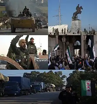 ![]() De izquierda a derecha: Ingreso del Gobierno de Salvación Nacional de Siria a Alepo; en esa misma ciudad los rebeldes destruyen la estatua ecuestre de Basel al-Ásad, hermano del presidente derrocado Bashar al-Ásad; milicianos del HTS luego de tomar Hama; celebraciones de la oposición en la mezquita de los Omeyas por la caída de Damasco y la huida de al-Ásad y retirada de las Fuerzas Armadas de Rusia en Latakia, bajo la supervisión del nuevo Gobierno de transición de Siria. | ||||