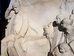 Se trata de un altorrelieve realizado en mármol de Carrara en el que se observa a Sarmiento sentado, con semblante pensativo, mientras un grupo de niños lo homenajea entregándole un conjunto de flores.