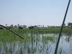 • Los elefantes son abundantes en el Okavango. Las señales de su avance son abundantes por todas partes: excrementos, árboles descortezados o derribados, sendas del paso de las manadas, que pueden ser de más de cincuenta individuos. Es fácil encontrarlos en las orillas de las islas, donde la vegetación es más abundante y no es raro ver a machos solitarios en islotes muy pequeños, ramoneando los árboles. Los elefantes no tienen problemas para desplazarse por un sistema acuático de poca profundidad como es el delta.