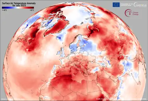 En 2023 se registró el mes de julio más caluroso en la Tierra en los últimos 120.000 años y el mes de julio más caluroso desde el inicio de la medición de la temperatura con un amplio margen.[5] Durante cada día de julio de 2023, dos mil millones de personas experimentaron condiciones de calor que se hicieron al menos tres veces más probables debido al cambio climático y 6,5 mil millones de personas experimentaron este impacto al menos un día al mes.[4]