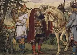 - ↑ La más antigua y creíble de las versiones parece que ha sido conservada en la Primera Crónica de Nóvgorod, que dice que Oleg se marchó "allende el mar" (por ejemplo a Escandinavia) y que fue enterrado allí.