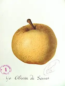 Olivier de Serres es el nombre de una variedad cultivar de pera europea Pyrus communis.[2] Esta pera está cultivada en la colección de la Estación Experimental Aula Dei (Zaragoza).[3] Esta pera variedad muy antigua, es originaria de Bélgica, tuvo su mejor época de cultivo comercial antes de la década de 1960, y actualmente en menor medida aún se encuentra.[4][5] Las frutas tienen una pulpa blanca, fina, completamente tierna, muy jugosa, con un sabor muy dulce y fragante, muy bueno.[6]