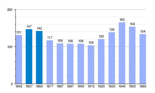 | Gráfica de evolución demográfica de Olmeda del Extremo[3] entre 1842 y 1960 |