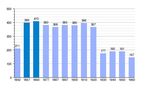 - Habitantes: 383 (1877), 368 (1887), 383 (1897), 380 (1900), 396 (1910), 367 (1920), 177 (1930), 190 (1940), 191 (1950), 147 (1960), 11 (2008).