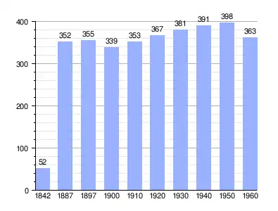 | Gráfica de evolución demográfica de Olmos de la Picaza[11] entre 1842 y 1960 |
