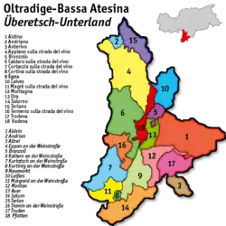 El comprensorio surtirolés de Oltradige-Bassa Atesina (en alemán Bezirksgemeinschaft Überetsch-Unterland o Überetsch-Südtiroler Unterland) se compone de 18 municipios del Oltradige (en alemán Überetsch) y de la Bassa Atesina (en alemán Unterland).