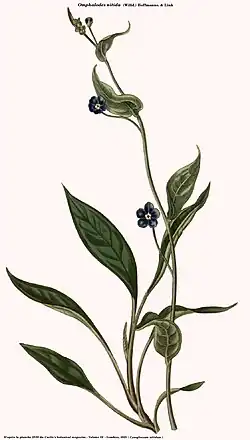 - ↑ «Omphalodes nitida». Tropicos.org. Missouri Botanical Garden. Consultado el 21 de septiembre de 2013.