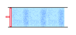 Cuando el émbolo comprime el fluido en contacto con él, aumenta la presión en esa zona, y, a su vez, esa región empuja a la inmediata propagándose así la onda por el tubo, transmitiendo así la perturbación de izquierda (desde el lugar donde está el émbolo) a derecha a lo largo del fluido. Cada partícula del fluido oscila en la dirección de propagación de la onda con las mismas características que el MAS del émbolo. Si se atiende a la periodicidad de la onda, como depende de la variable espacial, , y del tiempo, en el caso de ondas periódicas, al igual que con las ondas transversales, se hablará de una periodicidad temporal caracterizada por el periodo y una periodicidad espacial caracterizada por la longitud de onda .[21] Al considerar las ondas longitudinales que se propagan en un tubo de fluido, la forma de determinar experimentalmente la longitud de onda consistirá ahora en, fijado un tiempo t, medir la distancia entre dos máximos ( o mínimos ) consecutivos de la onda de presión en el tubo de fluido.