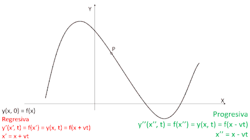 Se puede considerar idéntico razonamiento, si la perturbación avanza con una velocidad esta vez hacia la izquierda (existen dos posibilidades de desplazamiento para un movimiento en una dirección), se tendrá por el mismo razonamiento con una traslación de forma que al propagarse la onda con una velocidad , en un instante , el parámetro tome un valor pero ahora las ecuaciones de la traslación de coordenadas son
