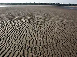 Ondulitas asimétricas en una llanura mareal arenosa. La corriente que las formó ha circulado de izquierda a derecha de la imagen.