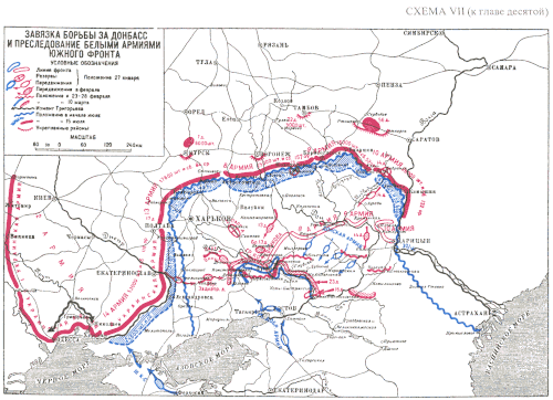 - ↑ Деникин А. И. Очерки Русской Смуты. Том V. Вооруженные силы Юга России. Глава 3. Наступление ВСЮР весною 1919 года: освобождение Дона и Крыма, взятие Харькова, Полтавы, Екатеринослава и Царицына. «Московская директива». Внутренние настроения