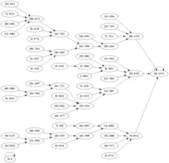 31104443 → 43255222 → 33204323 → 41055442 → 54155311 → 44404112 → 43313222 → 31104443 42104432 → 43204322 → 42104432 53104421 → 53304221 → 53104421 | |