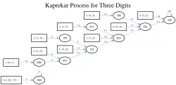 Análogamente al caso de cuatro dígitos, la secuencia siempre convergerá a un valor, en este caso al 495 (la constante de Kaprekar de tres dígitos en base 10),[5] salvo los números con tres cifras iguales que convergerán a la constante trivial.