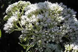 Arbustos hasta de 3 m de alto, con tallos erectos o ascendentes. Hojas opuestas, con pecíolos hasta de 1,5 cm de largo; láminas ovadas a anchamente ovadas, de base redondeada, a veces asimétrica, y ápice agudo, margen aserrado, plano. Capítulos entre 250 a 300, reunidos en inflorescencias cimoideas, compuestas de corimbos densos, terminales y axilares, con hojas persistentes poco desarrolladas. Involucro acampanado. Receptáculo plano, epáleaceo, glabro. Flores de 5 a 10 por capítulo, corolas blancas, infundibuliformes. Anteras con base de las tecas obtusas, apéndice conectival nulo. Estilo de 5,5 mm de largo, largamente exerto, ramas del estilo clavadas en el ápice. Aquenios piriformes, negruzcos, seríceos. Papus formado por 25 cerdas blanquecinas aproximadamente, hasta de 2,3 mm de largo.[4]