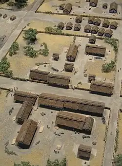 Esta ciudad de forma circular, en su máxima expansión, ocupaba 380 hectáreas y estaba rodeada por una muralla de 7,2 km de longitud. Dentro hay varias zonas: una de hasta 500 m de ancho junto a la muralla, de ocupación esporádica y carente de edificios (zona húmeda de pastos y de cultivo). La zona central de 1,4 km de longitud con 80 ha estuvo densamente habitada: huellas de cimientos de edificios con funciones precisas para la agricultura, diversos oficios y el culto. Se han encontrado restos de un templo. Esta parte fue utilizada desde finales del siglo IV a. C. Depósitos de armas, arreos, piezas de calderos, una plaza adoquinada y un gran número de huesos de niños y lactantes evidencian su uso para el culto. Hasta ahora se han descubierto otros tres complejos que podrían identificarse como partes de un santuario.