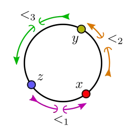 El conjunto de todos los cortes está ordenado cíclicamente por la siguiente relación: [<1, <2, <3] si y solo si existe x, y, z tal que:[22]