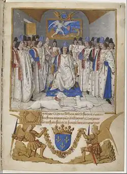 ![]() El rey Luis XI de Francia presidiendo la orden reunida en el Monte Saint-Michel. El cuadro representa al arcángel Miguel matando a un dragón. Cubierta de los Estatutos de la orden de San Miguel. Ilustración hecha por Jean Fouquet (1469-1470). Biblioteca nacional de Francia (BnF).[1] | ||