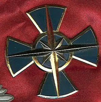 La insignia de la orden variaba según la división y el grado dentro de la misma, pero contaba como base con una cruz patada alisada y redondeada con bordes dorados y esmaltada en azul oscuro.