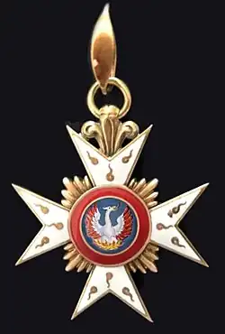 La insignia de la orden consiste en una cruz de malta esmaltada de blanco con bordes dorados. En el centro de la cruz se dispone un medallón circular esmaltado que muestra un fénix surgiendo de entre las llamas. En cada uno de los brazos de la cruz se disponen también tres llamaradas doradas sobre el esmalte blanco. Entre los brazos de la cruz se disponen rayos dorados, tomando una forma cuadrangular alrededor de la cruz y el medallón circular.