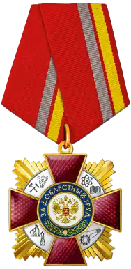 - Grandes logros en las actividades laborales (de servicios) destinadas a fortalecer y desarrollar el potencial económico y defensivo de la Federación de Rusia;