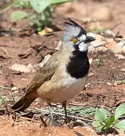 Los adultos miden entre 19 cm a 23 cm de longitud.[5] Los machos adultos tienen cabeza color gris con pecho negro prominente, frente y garganta blancas, siendo el resto de su cuerpo de color gris o pardo.[6] Las hembras y los juveniles tienen colores menos prominentes que los machos, no poseen el pecho negro y tienen una cresta más pequeña ladeada. Tanto los machos como las hembras tienen ojos color rojo-anaranjado.[6]