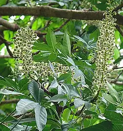 Árbol de corteza grisácea. Posee hojas que varían de forma de 5 a 9 foliolos de 10-25 cm con peciolos largos. Los márgenes de las hojas pueden ser aserrados. Inflorescencia en panículas con cabezuelas. Su fruto es una baya. Es carnosa, jugosa, de color blanco tornándose morados al madurar. Florece de febrero a abril. Alcanza una altura de 18 m.